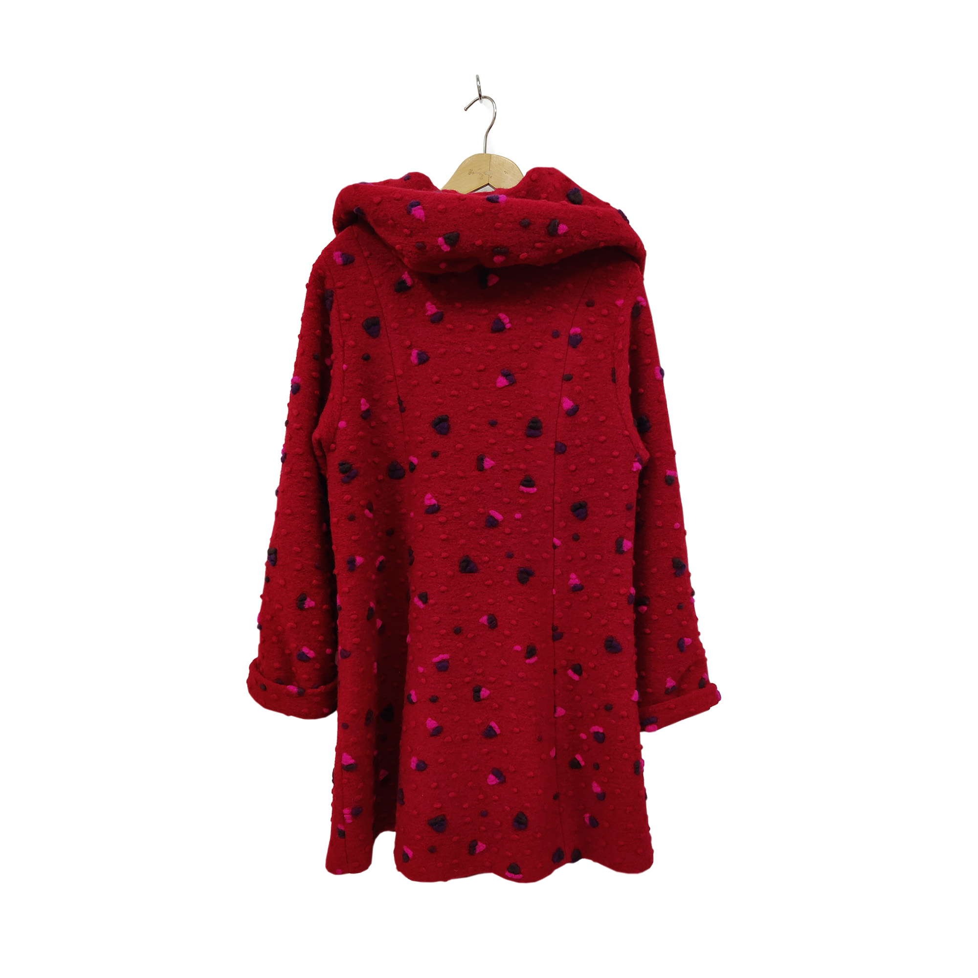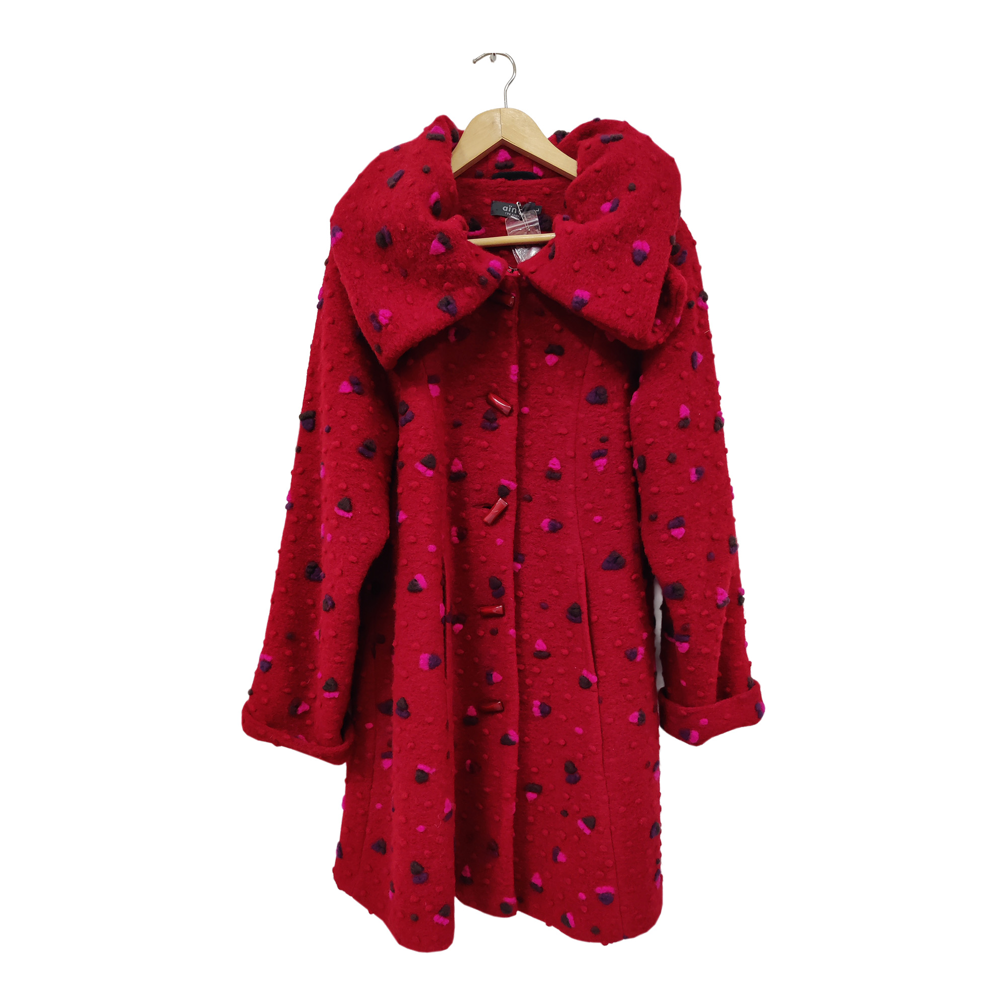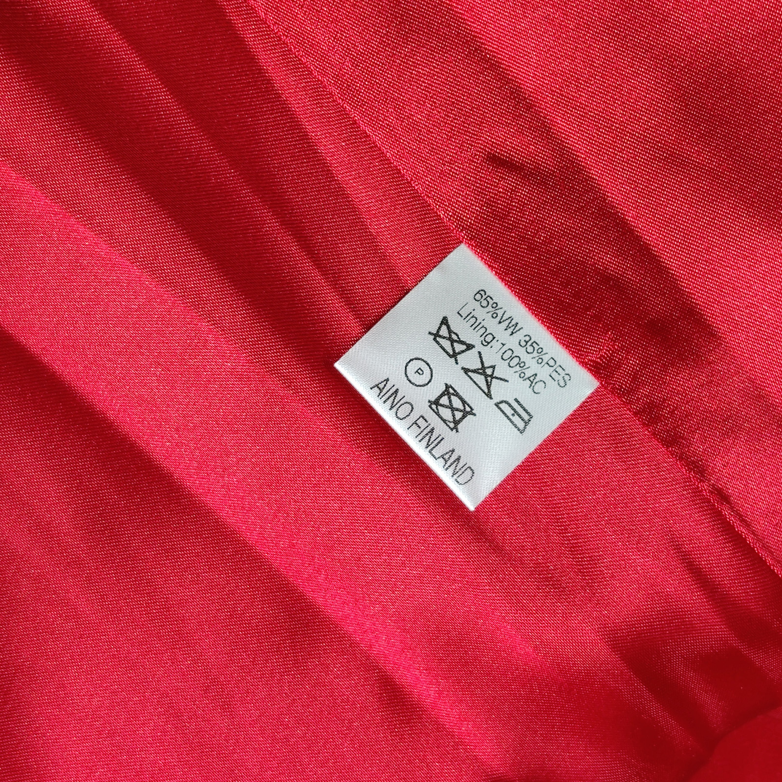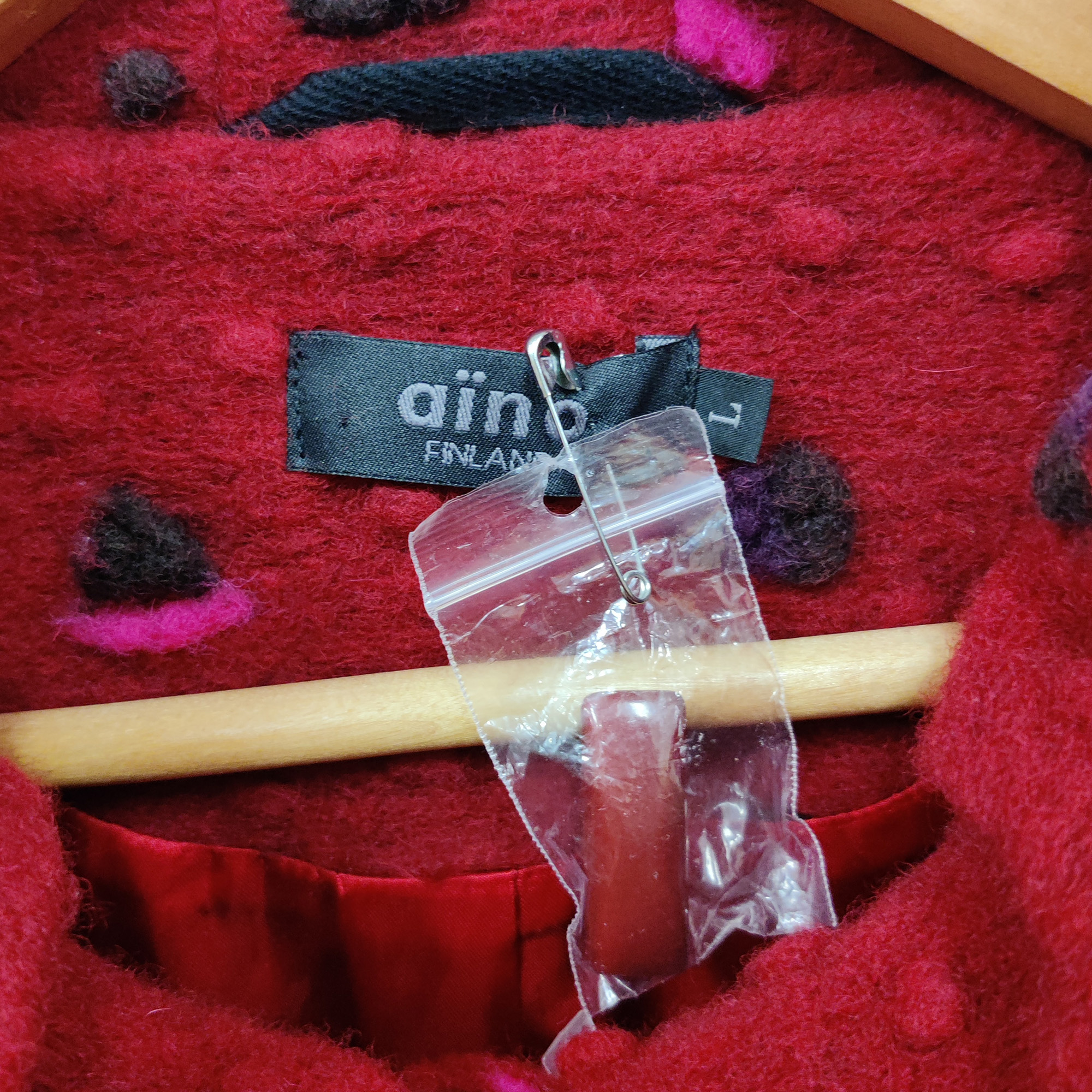 Kotimainen Aino-merkkinen villakangastakki, koko L, väri tummanpunainen.Takki on hyvässä käytetyssä kunnossa.Mitat: Rinnanympärys (kai–kai): n. 5t cm, pituus (olka–helma): n. 100 cm.
