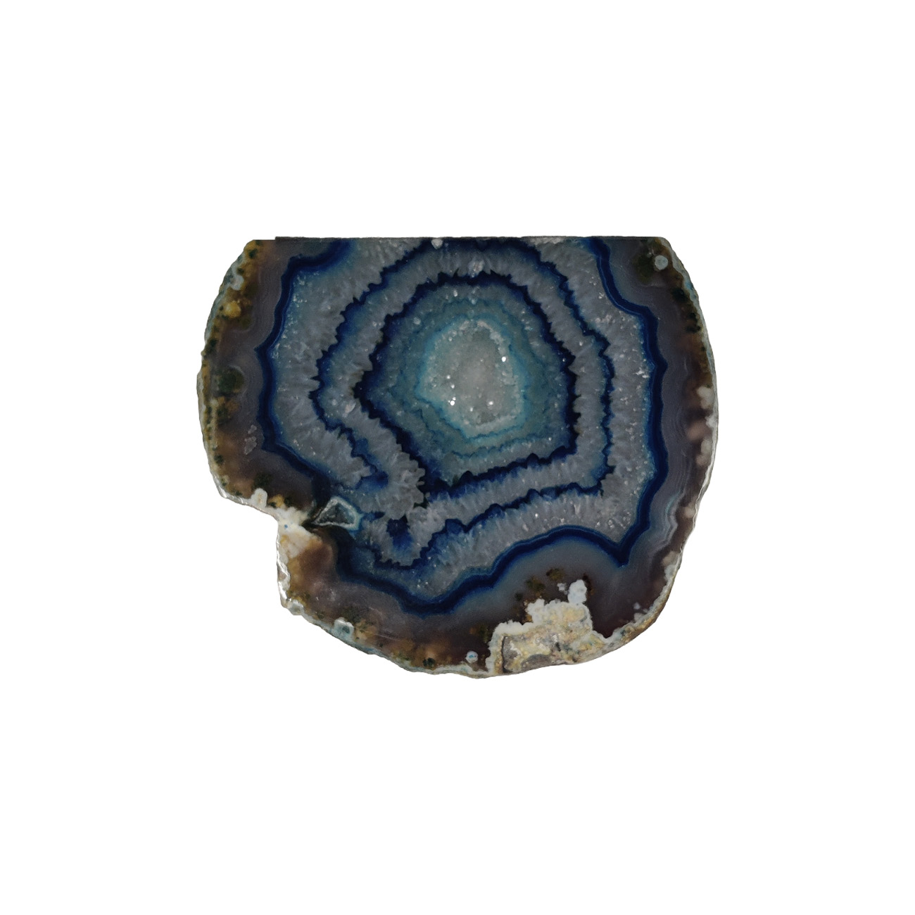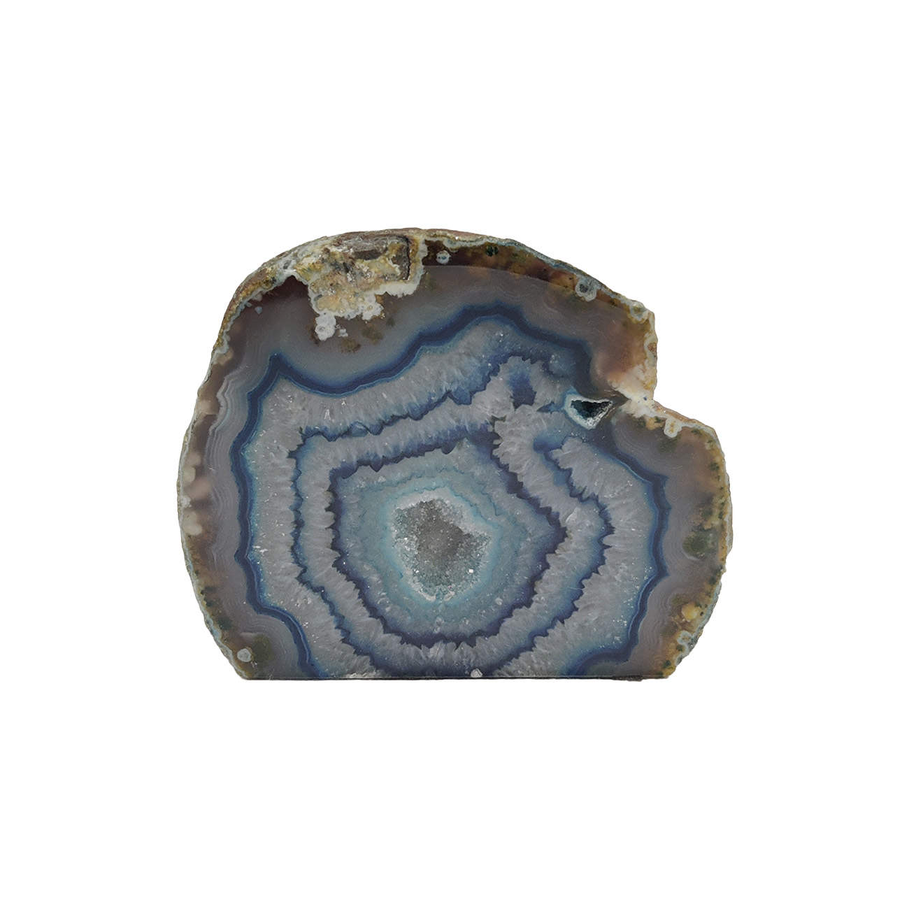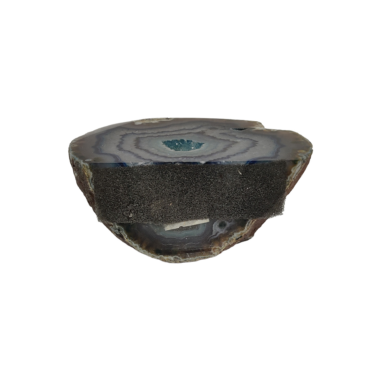 Kaunis akaattigeodi jalokivi, hyvässä kunnossa.Paino: noin 477 g.Mitat: n. 9,5 × 8 cm.