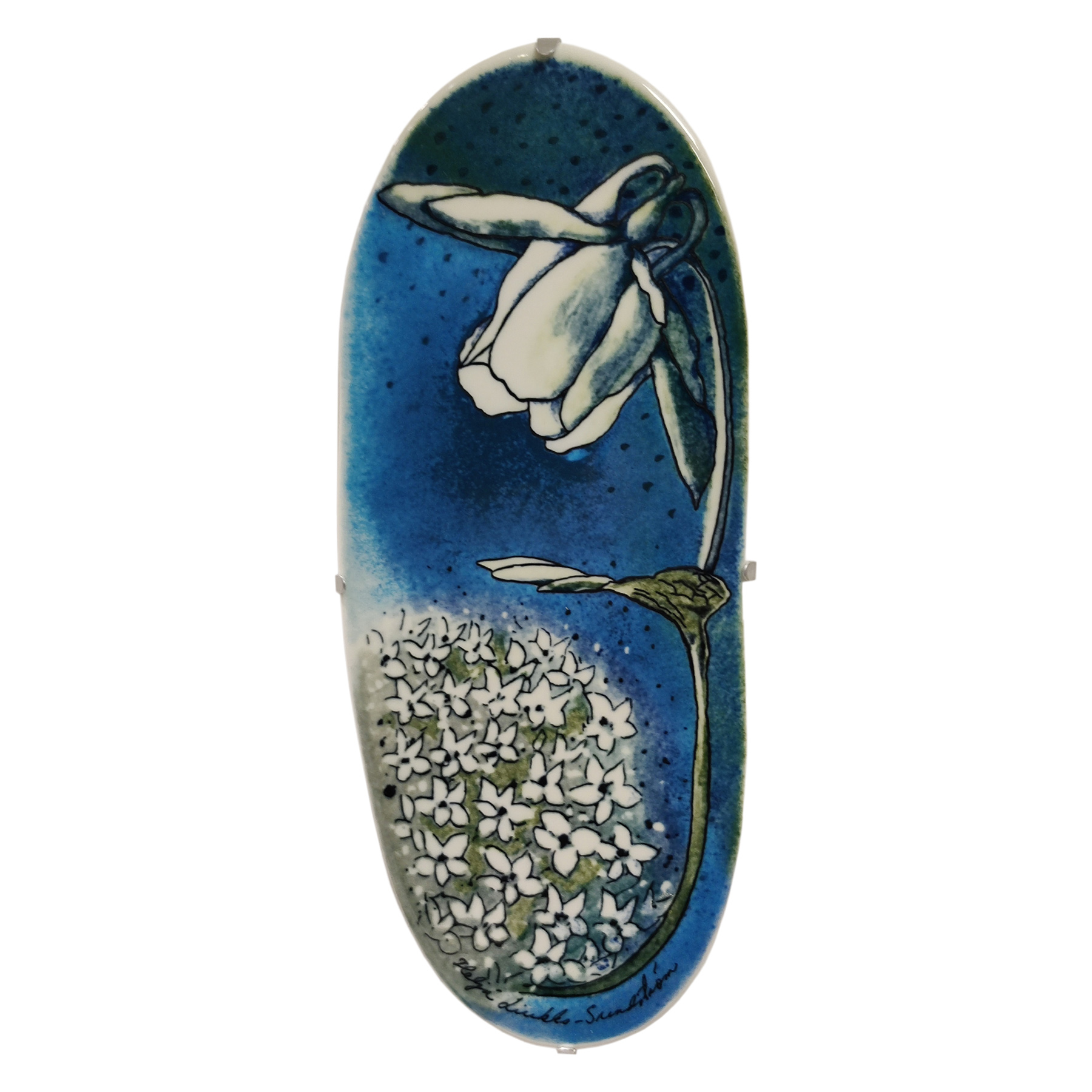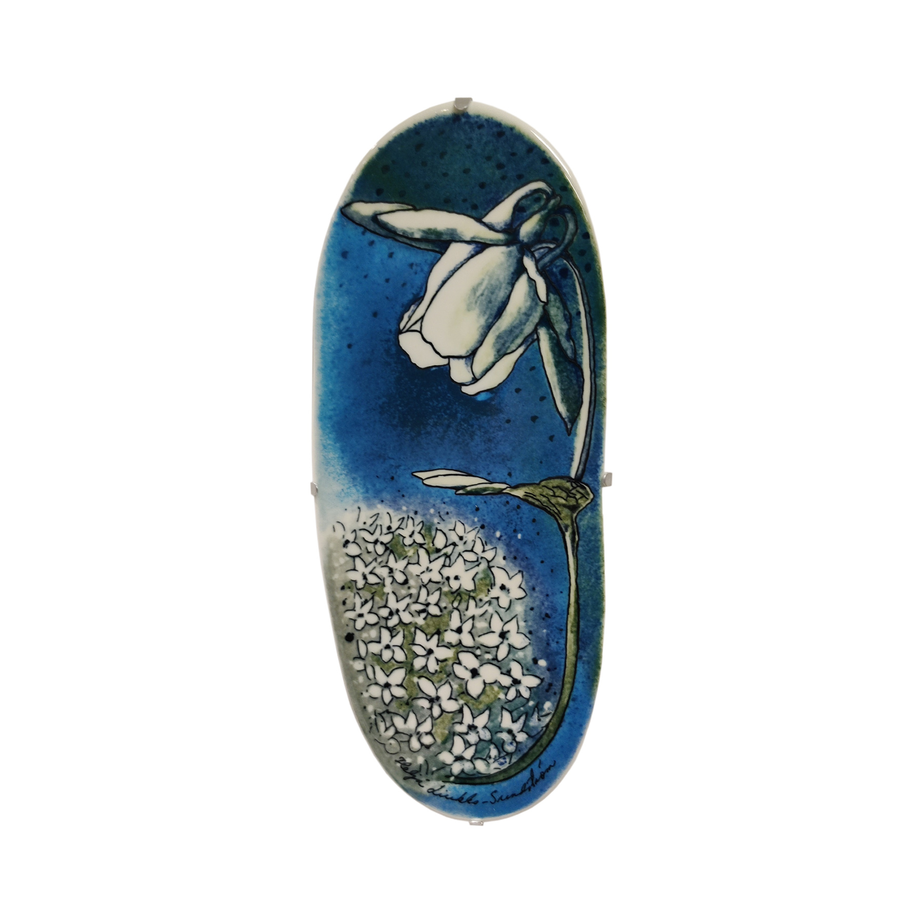 Heljä Liukko-Sundström – Aikaan valkovuokkojen -seinälaatta, Arabia, 1990-luku.Kaunis keramiikkalaatta hyvässä kunnossa.Mitat: noin 13 × 32 cm.