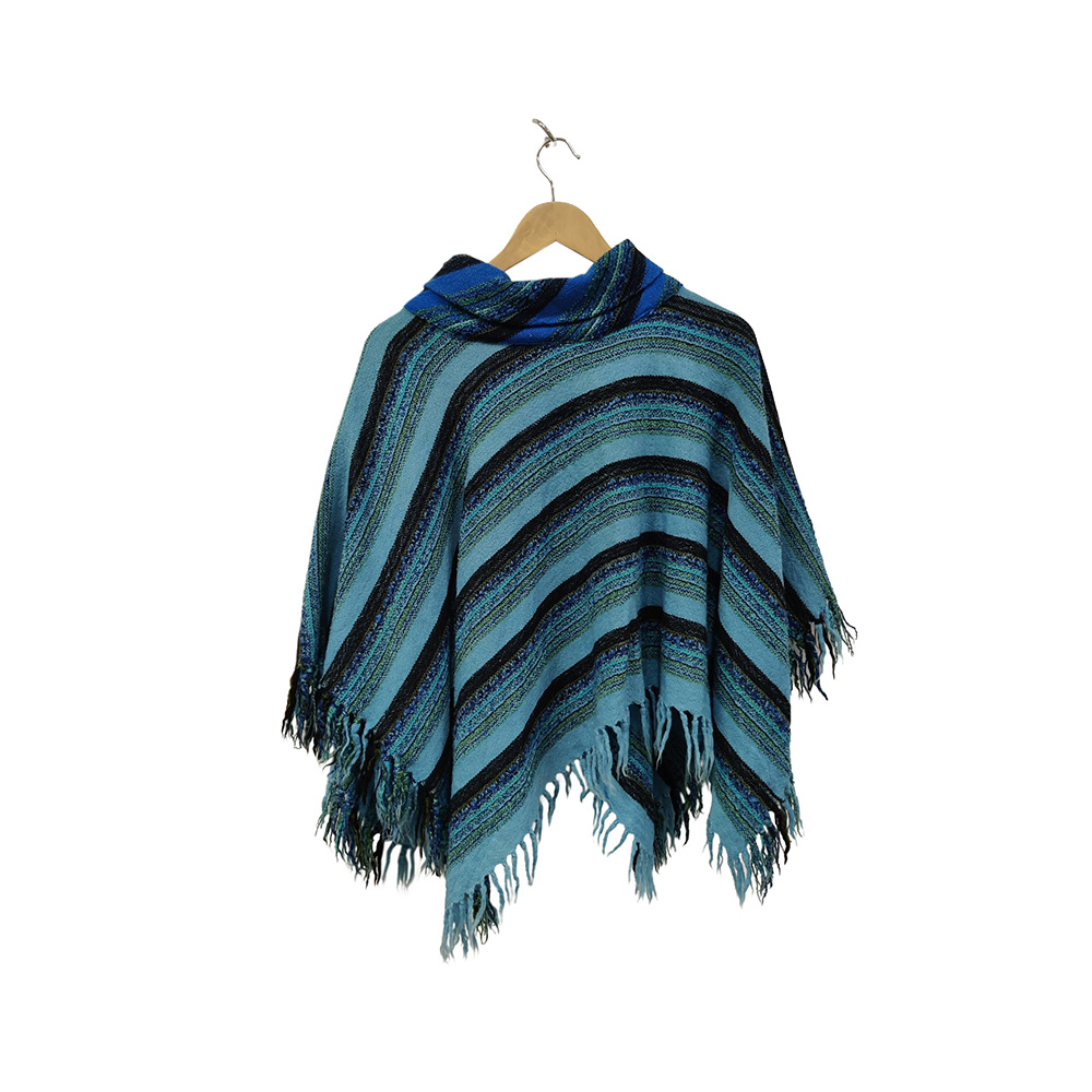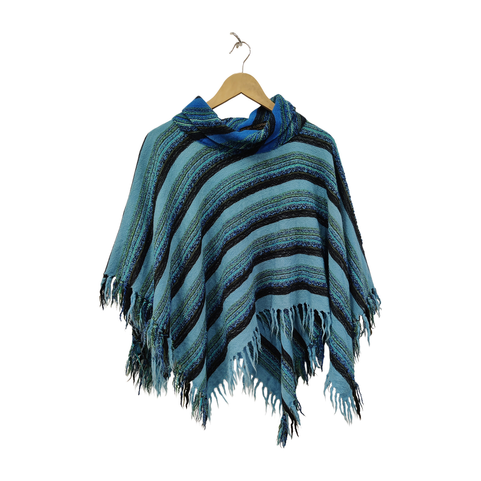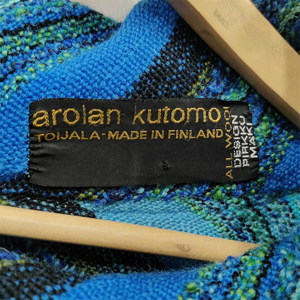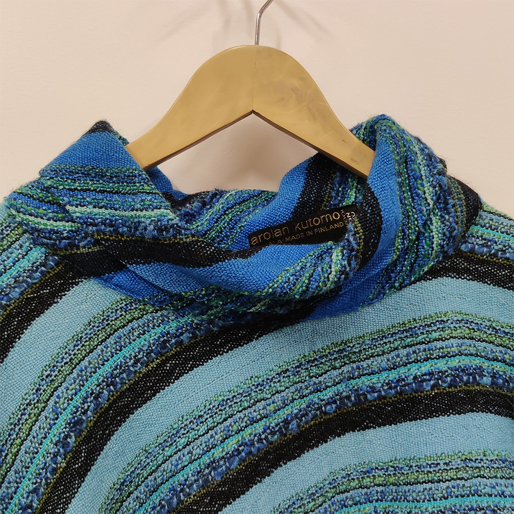 Arolan Kutomon one size -poncho sinisessä sävyssä, kaulus tummemman sininen. Valmistettu Suomessa. Suunnittelija Pirkko Mäki, materiaali villaa. Poncho on hyvässä käytetyssä kunnossa. One size – sopii arviolta S–L -kokoisille.