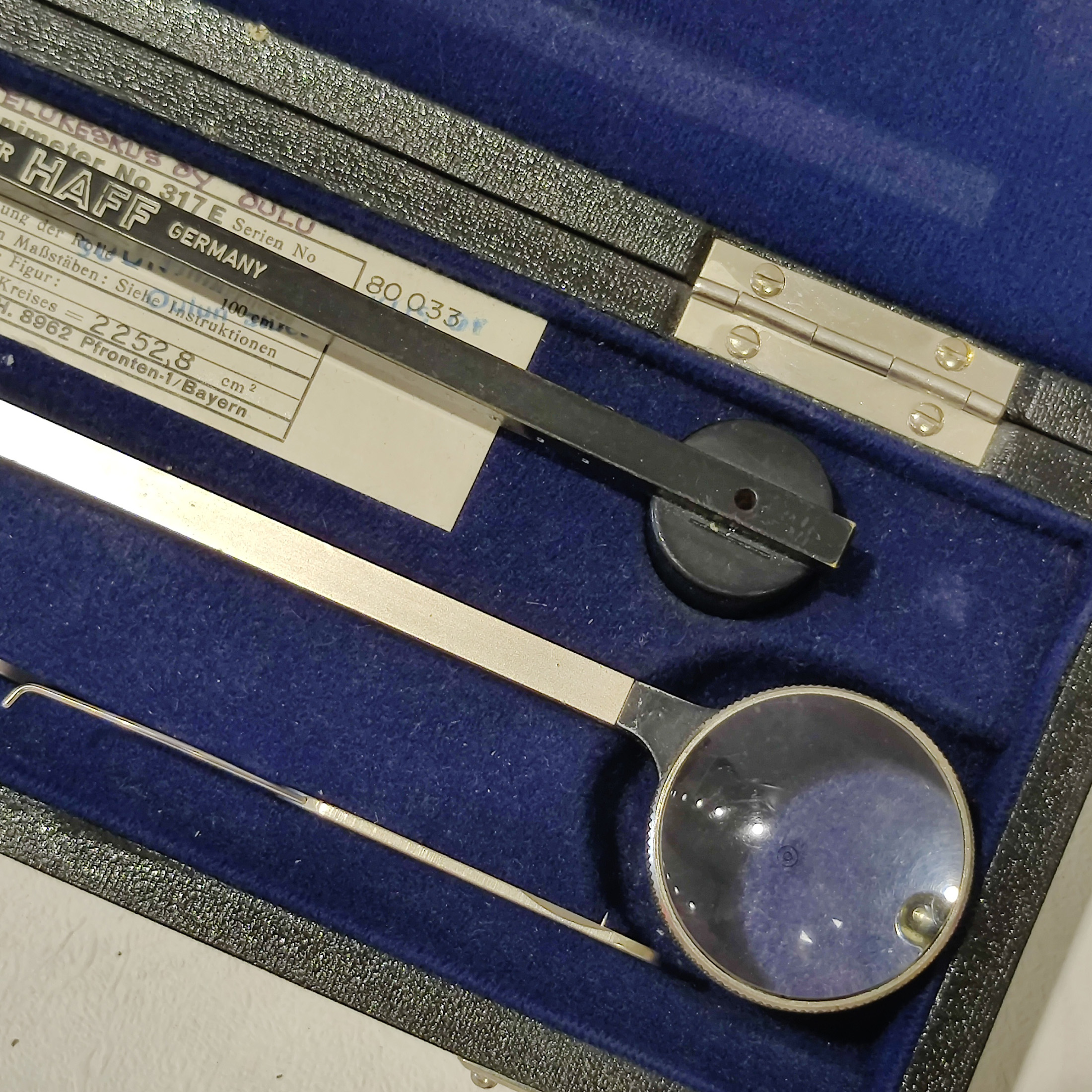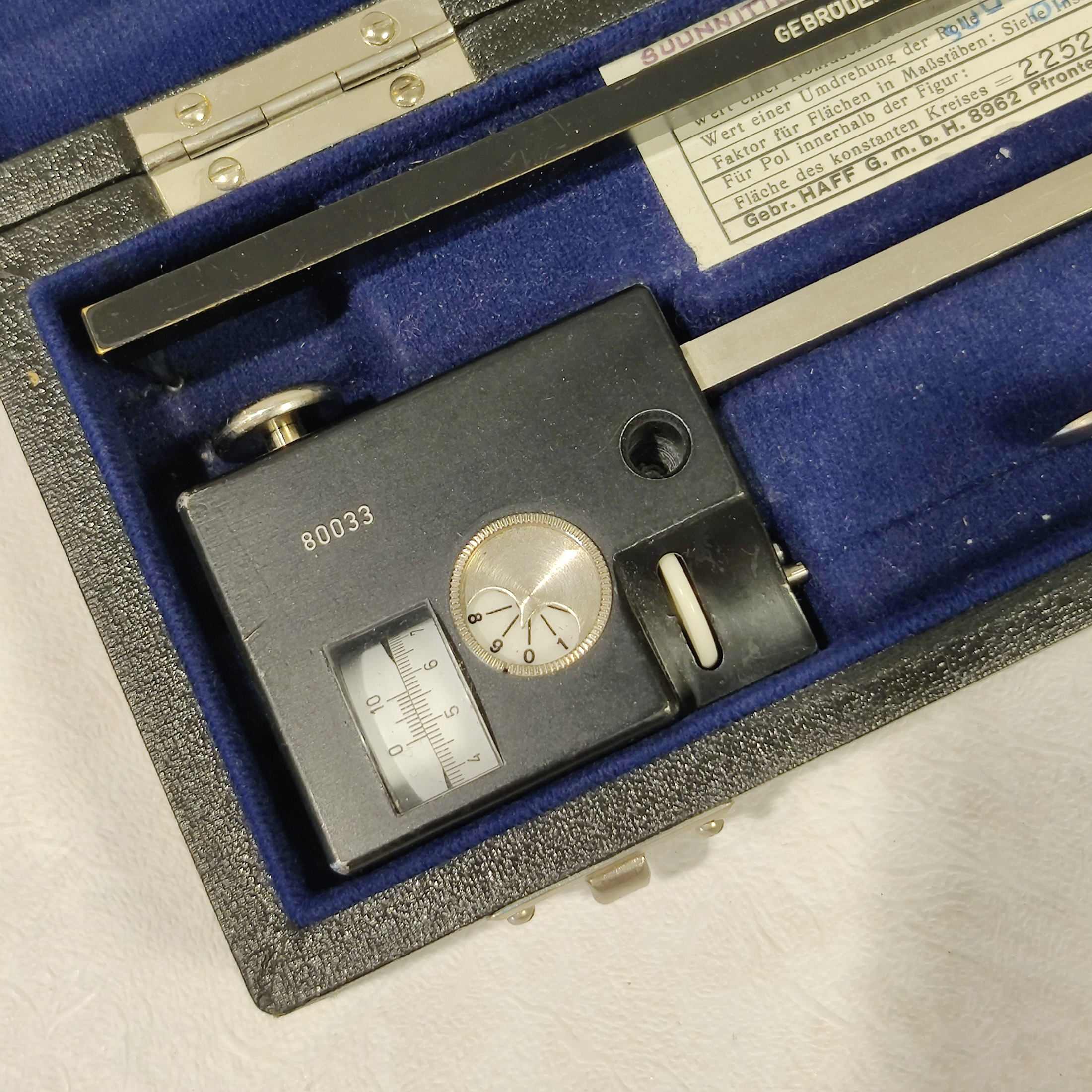 Laadukas saksalainen planimetri pinta-alojen mittaamiseen kartoilta ja kaavioilta.Koko setti, kaikki osat tallella alkuperäisessä kotelossa.Hyvä vintage kunto.Kotelon mitat: n. 26 × 9,5 × 5 cm.