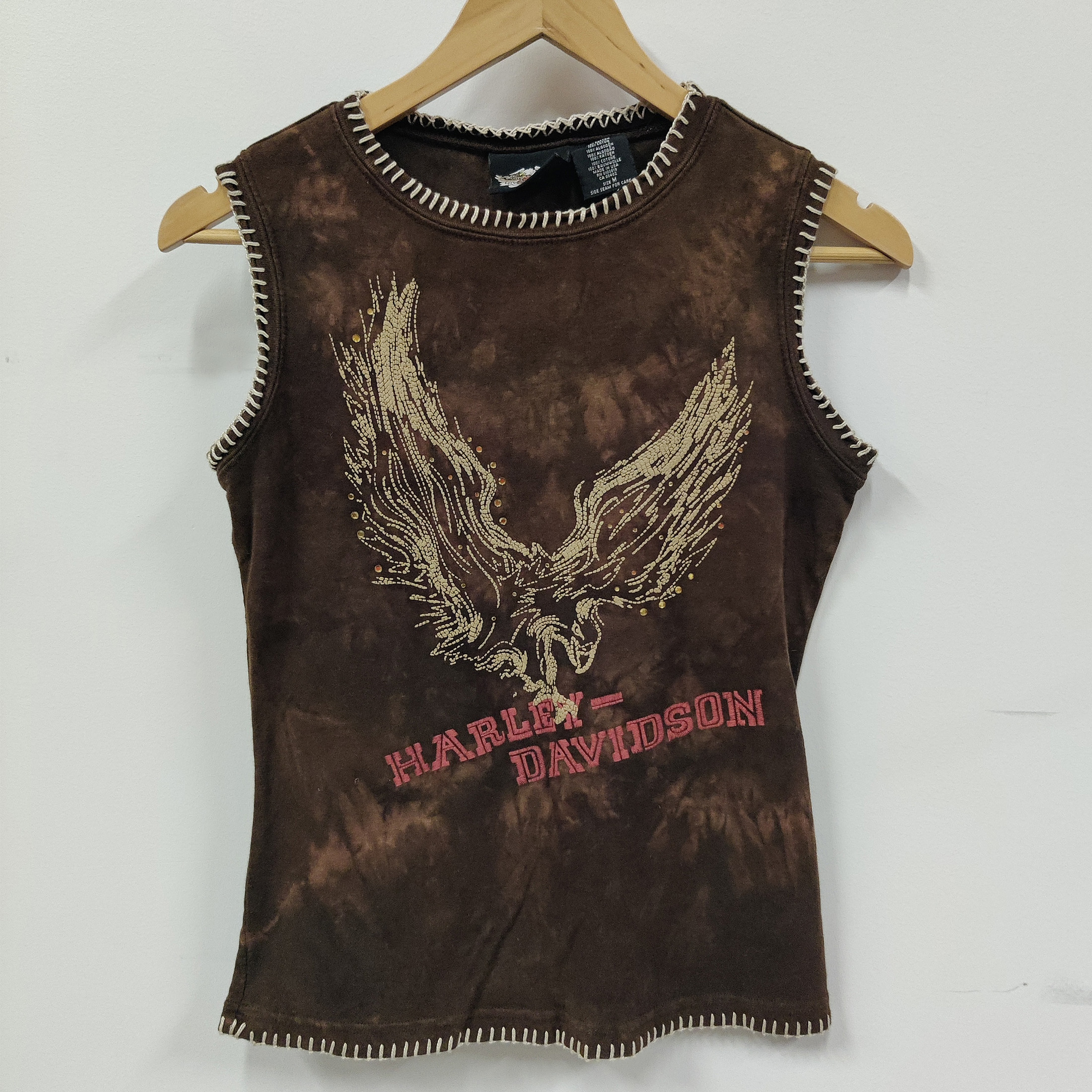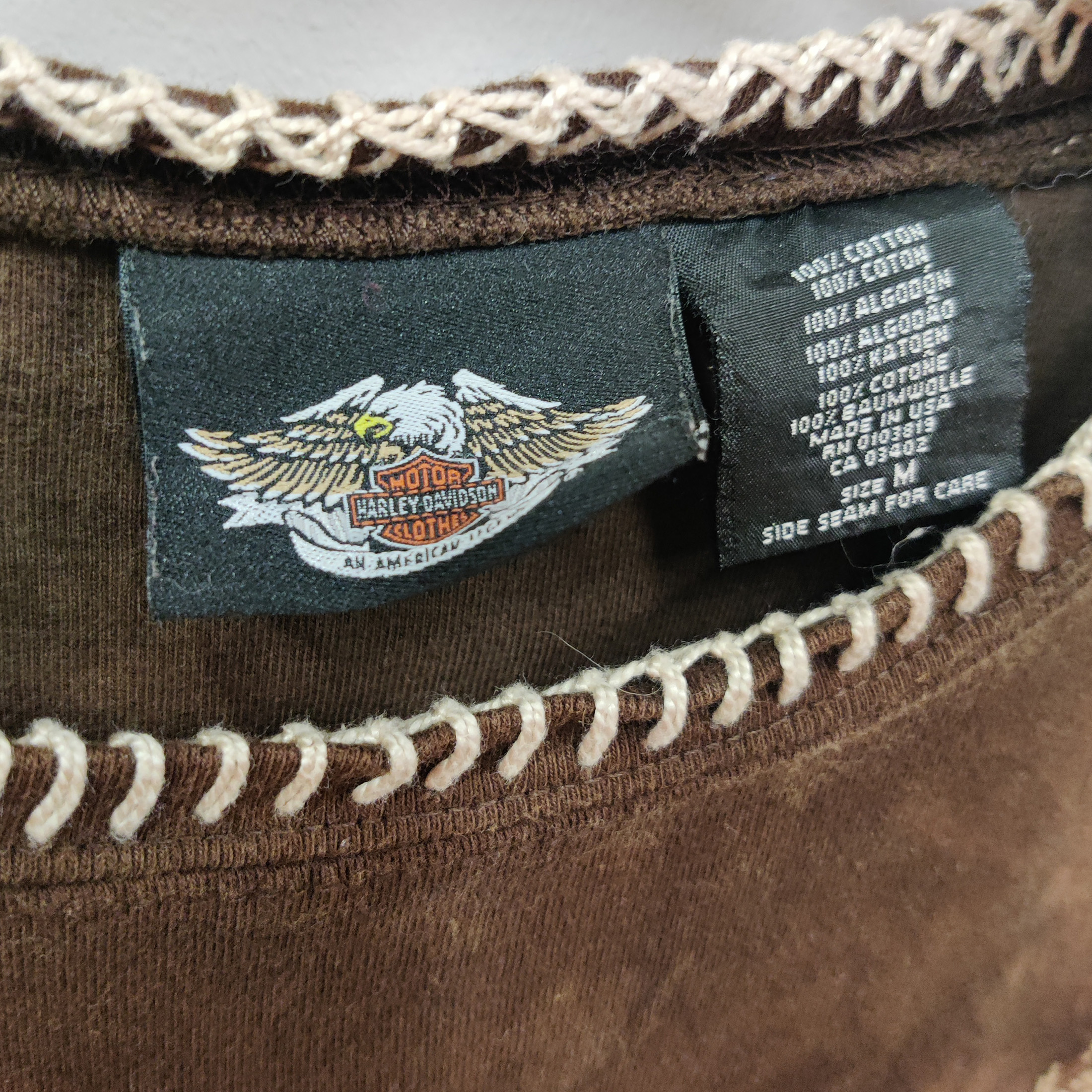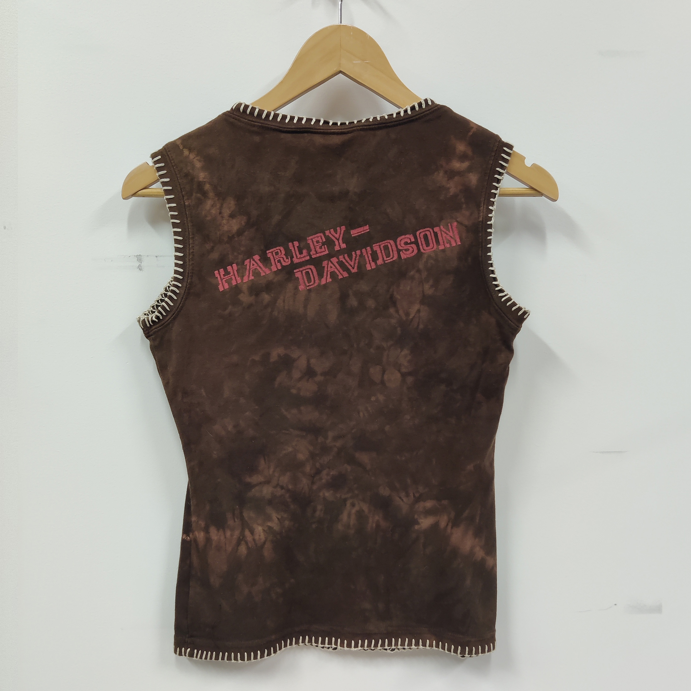 Naisten hihaton Harley-Davidson -paita ruskeassa sävyssä. Paita on hyvässä käytetyssä kunnossa ja sopii rentoon tai rock-henkiseen tyyliin.Mitat: Koko MKai–kai: 44 cmPituus: 58 cm