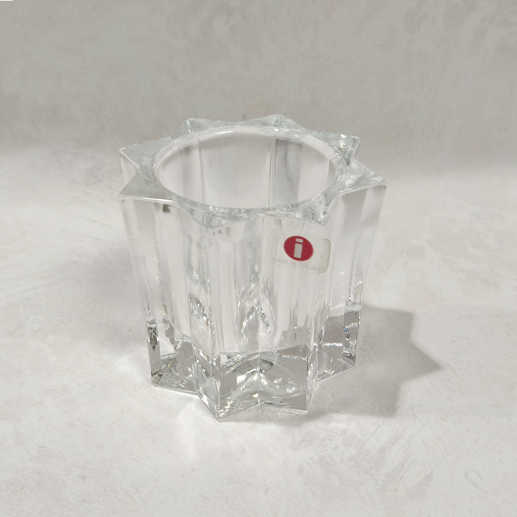 Iittala Tähti -kynttilälyhty kirkkaasta lasista, 1980-luvulta.Suunnittelija Kerttu Nurminen.Hyvässä käytetyssä kunnossa.Mitat: n. 7 × 6 cm.
