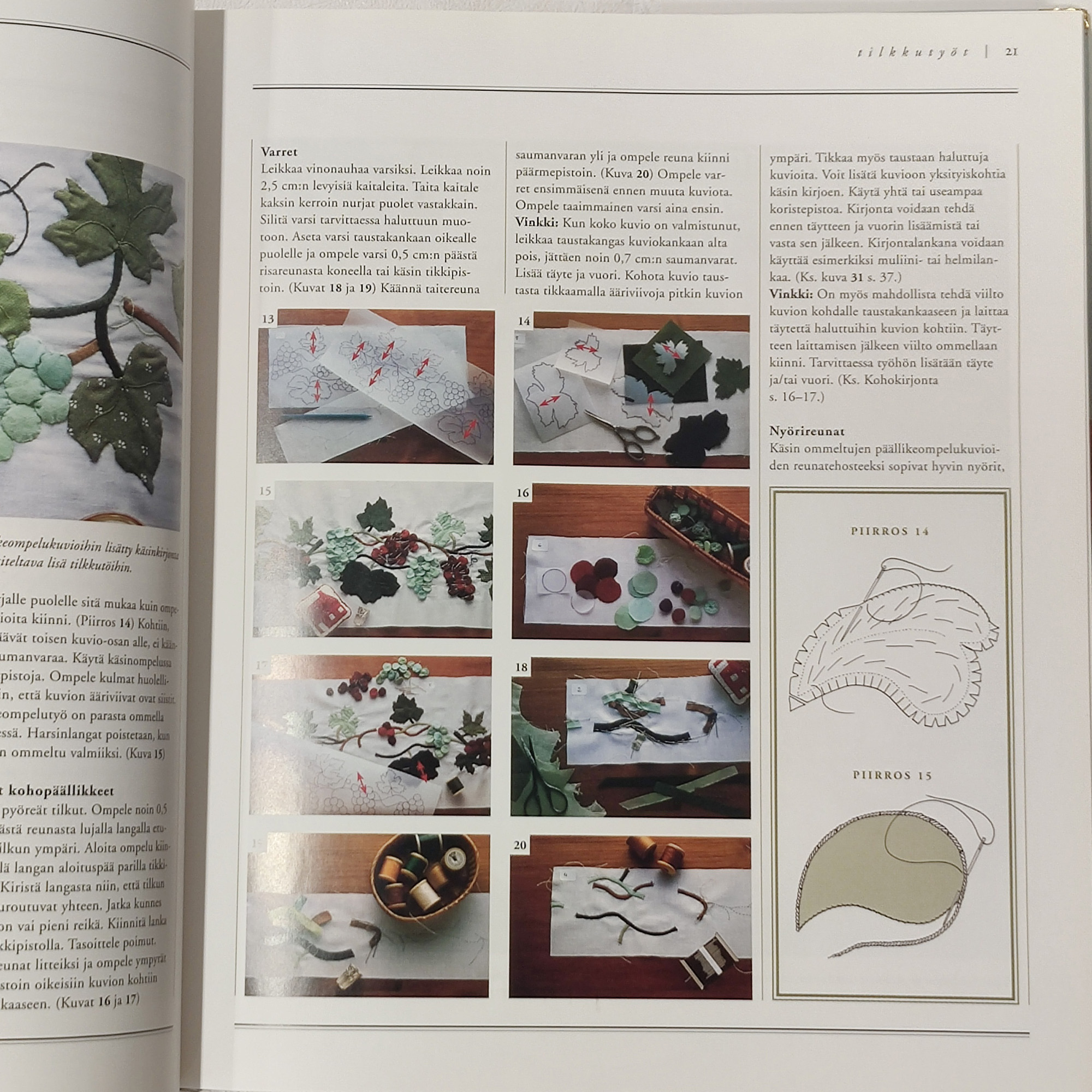 Käden taidot tarjoaa monipuolisia tekniikoita ja ideoita tilkkutöihin, solmeiluun, värjäykseen ja silkkimaalaukseen.Kieli: Suomi.Hyvä käytetty kunto.Mitat noin 24,5 x 28,5 cm.