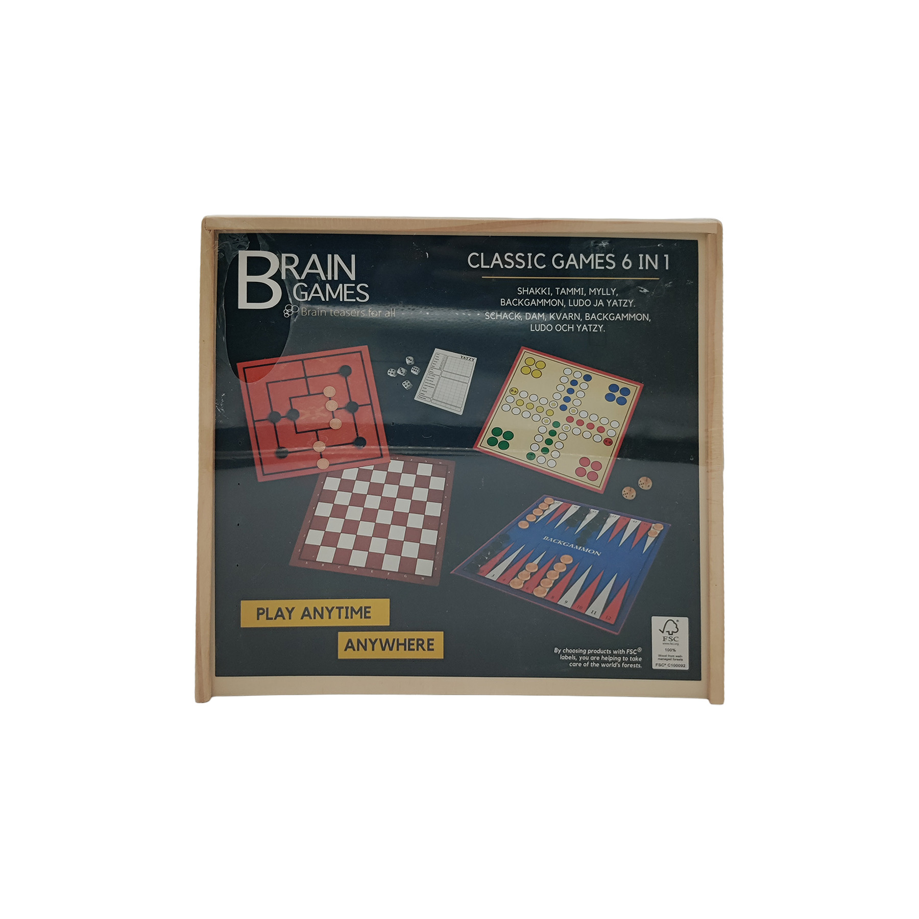 Klassikkopelit 6 in 1 -pelisetti kätevässä laatikossa.Sisältää kuusi klassikkopeliä: shakki, tammi, mylly, backgammon, ludo ja yatzy.Uusi ja käyttämätön, muovipakkauksessa reikä.Mitat n. 28 × 28 cm.