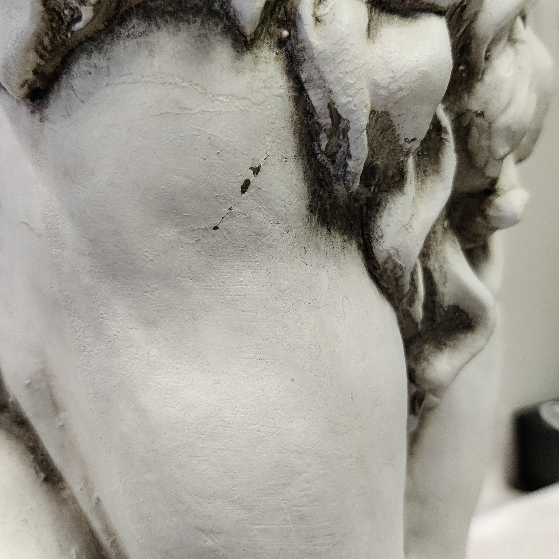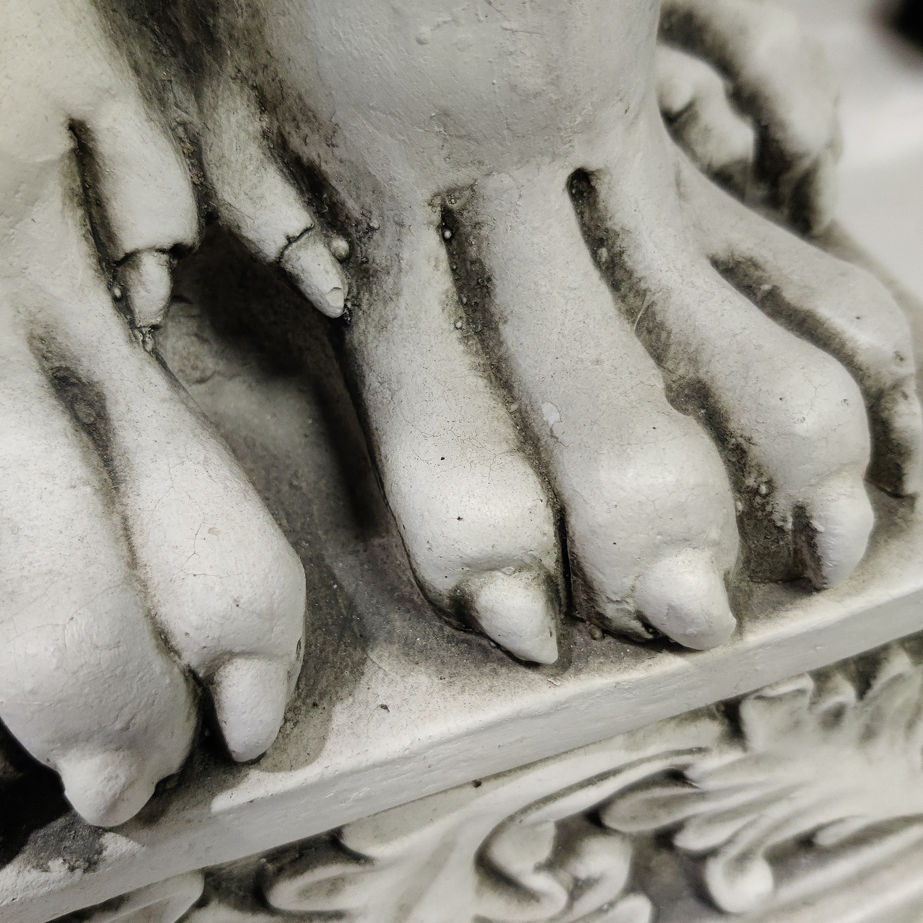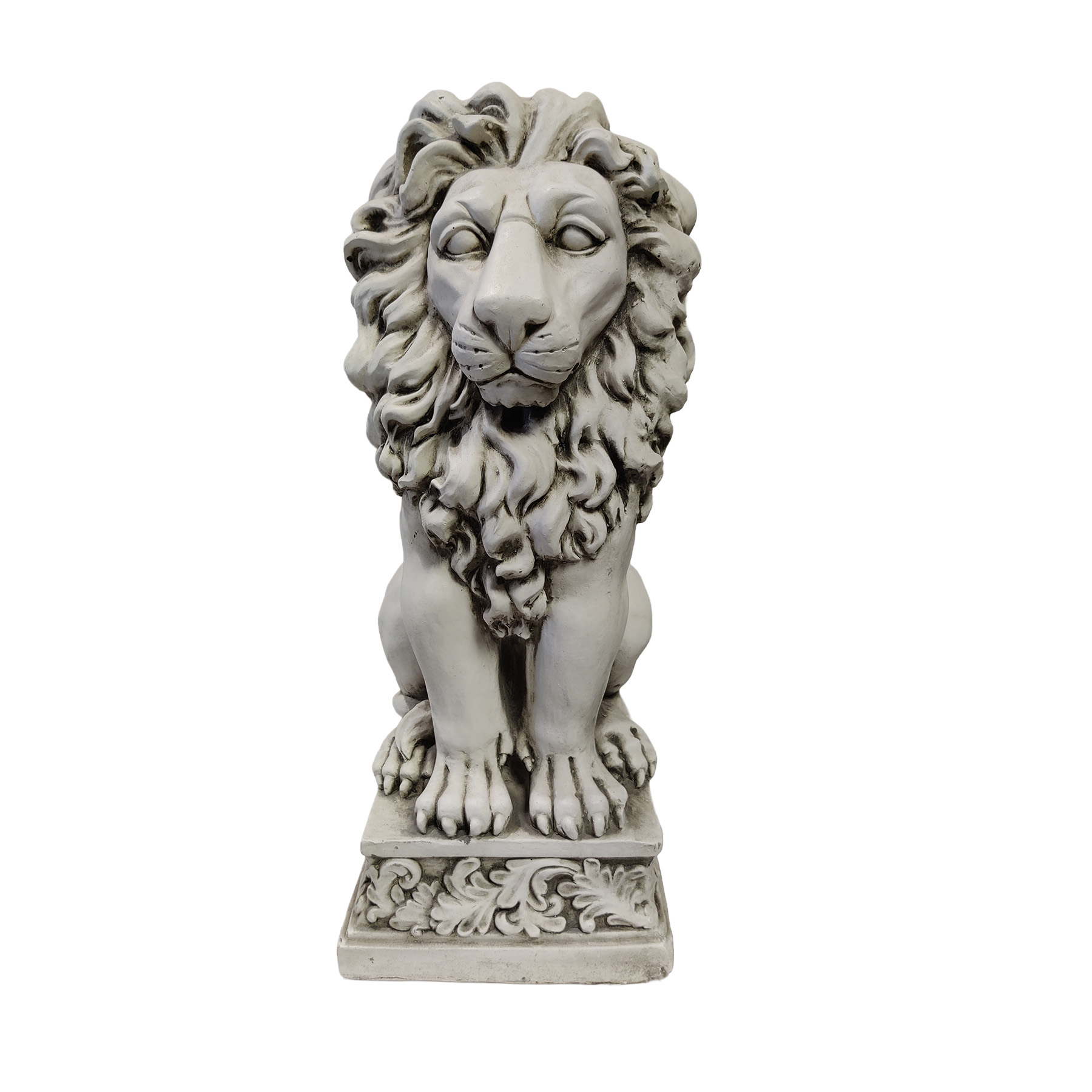 Kipsi leijona patsas.Hyvä käytetty-kunto, vähän käytönjälkiä (katso kuvat).Mitat: n. 61 x 27 x 24 cm.