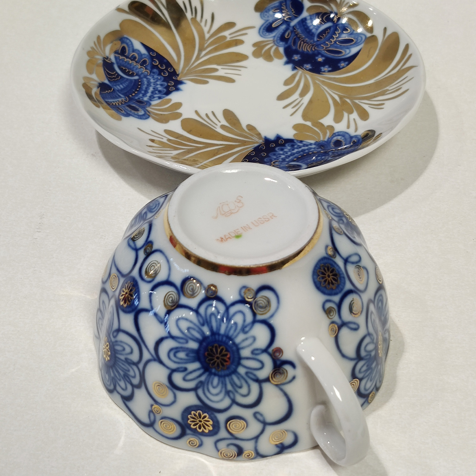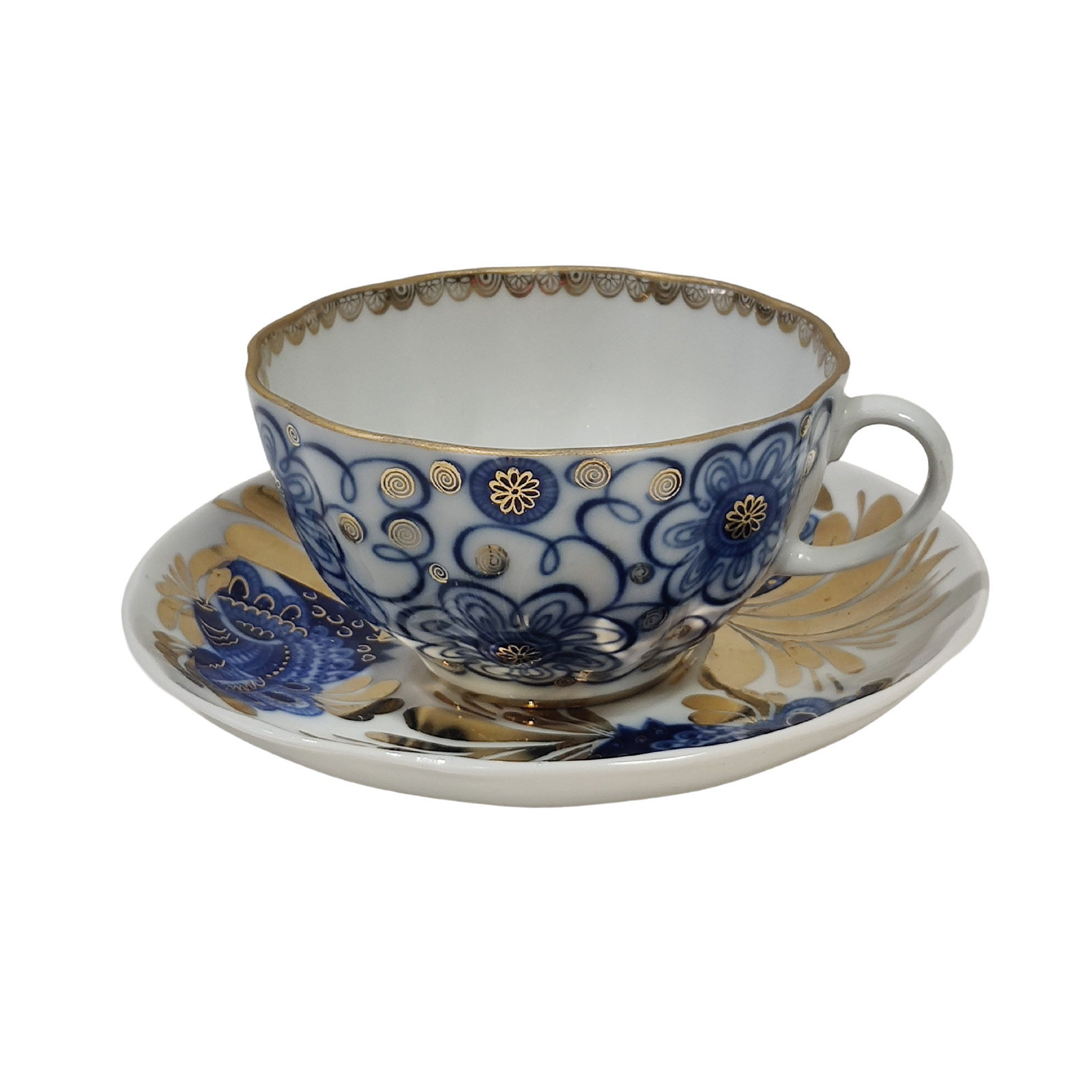 Lomonosov kuppi ja lautanen, Bindweed kuviolla.Hyvä vintage-kunto, kultakoristelu hieman kulunut.Mitat: kuppi: korkeus n. 5,8 cm, halkaisija10 cm; lautanen: korkeus n. 2,5 cm, halkaisija 15 cm.