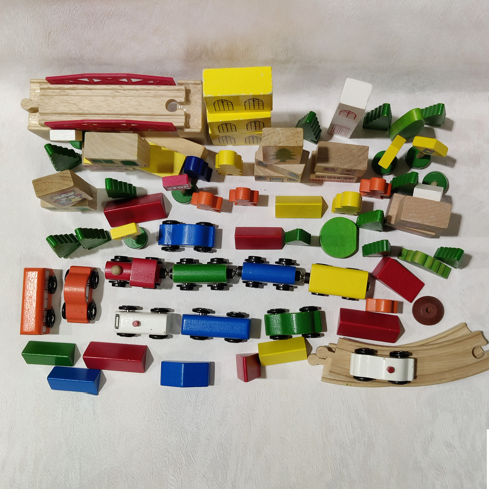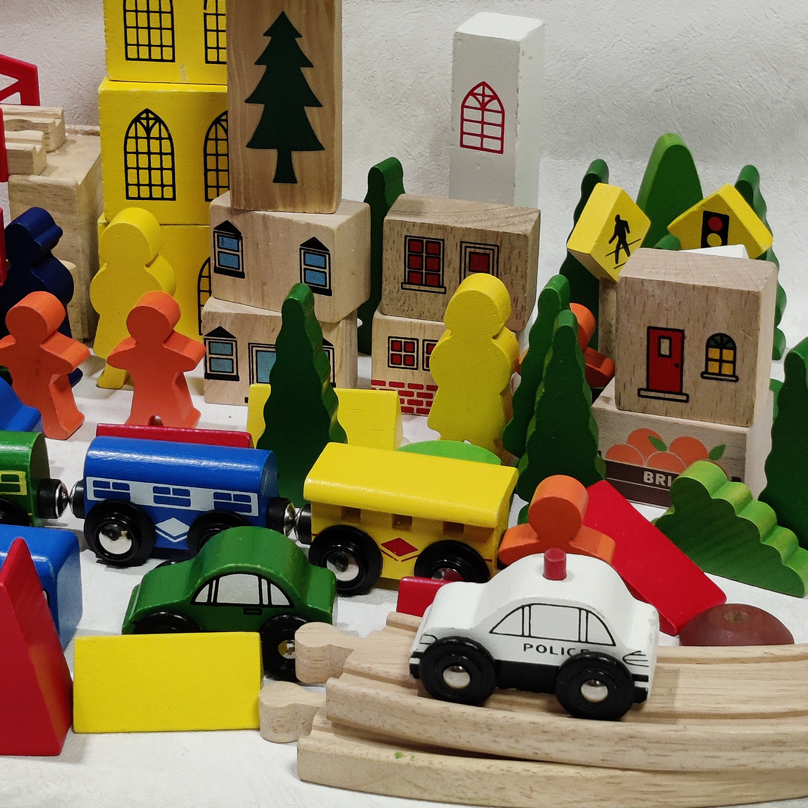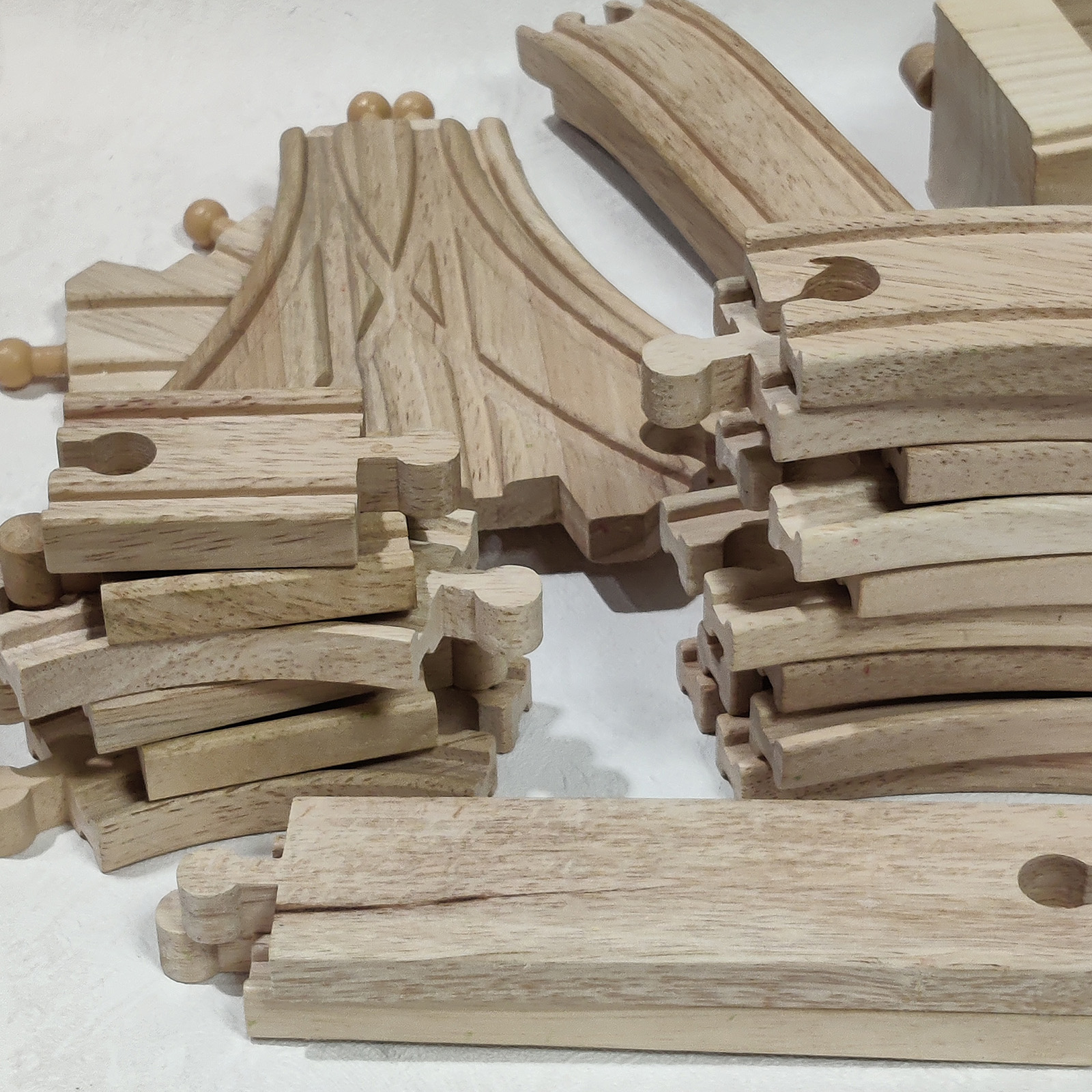 Monipuolinen ja värikäs puinen junaratasetti, joka koostuu Biltema-, BRIO- sekä muiden merkkien osista. Setti sisältää puisia kiskoja, junavaunuja, rakennuksia ja muita lisäosia, joilla lapsi voi rakentaa oman mielikuvituksellisen junamaailmansa.