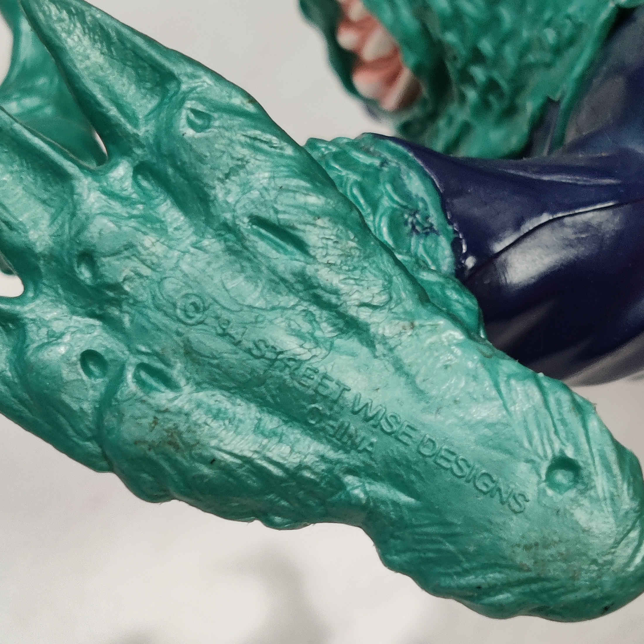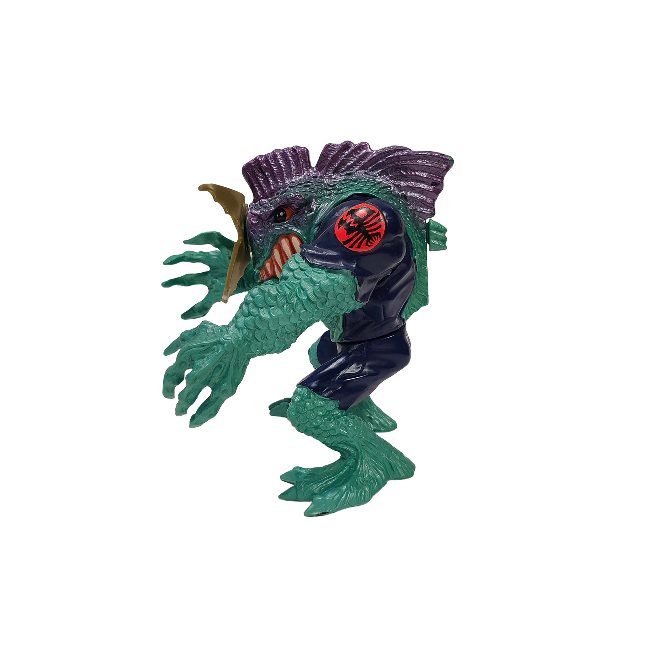 Mattelin valmistama Street Sharks -sarjan Slash-hahmo vuodelta 1994.HUOM. Porakärki puuttuu.Hyvä vintage-kunto.Mitat: noin 14 cm × 11 cm.