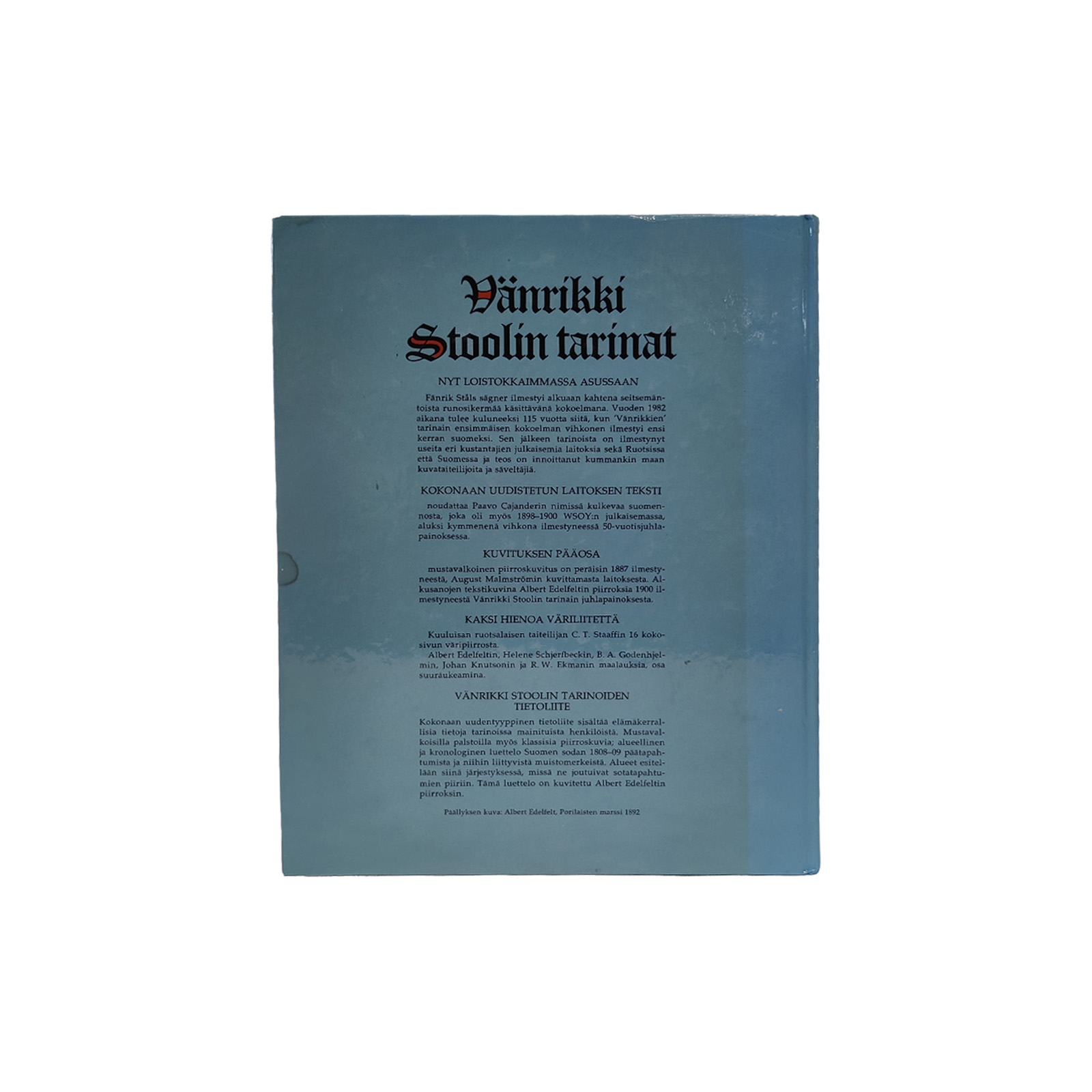Vänrikki Stoolin tarinat, Johan Ludvig Runeberg.Kunto tyydyttävä. Kansipaperissa kulumaa.Kieli: Suomi.Mitat: n. 25 × 31,8 cm.