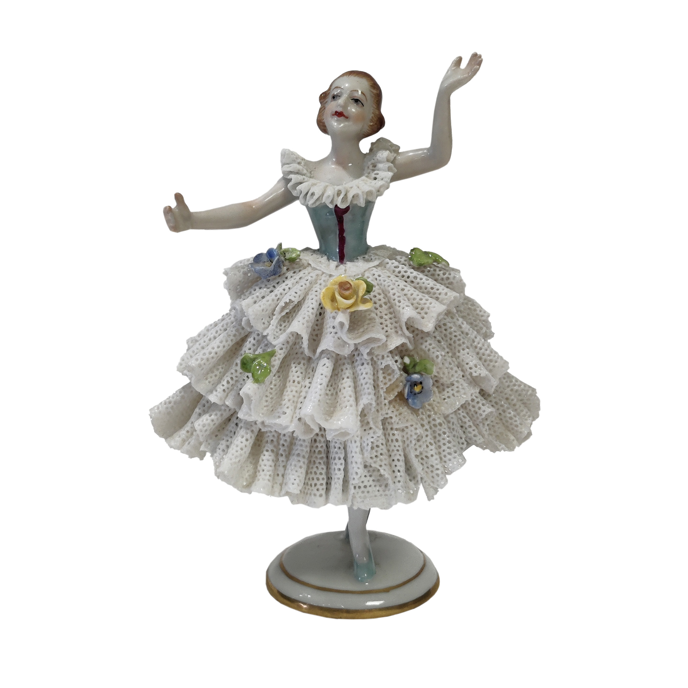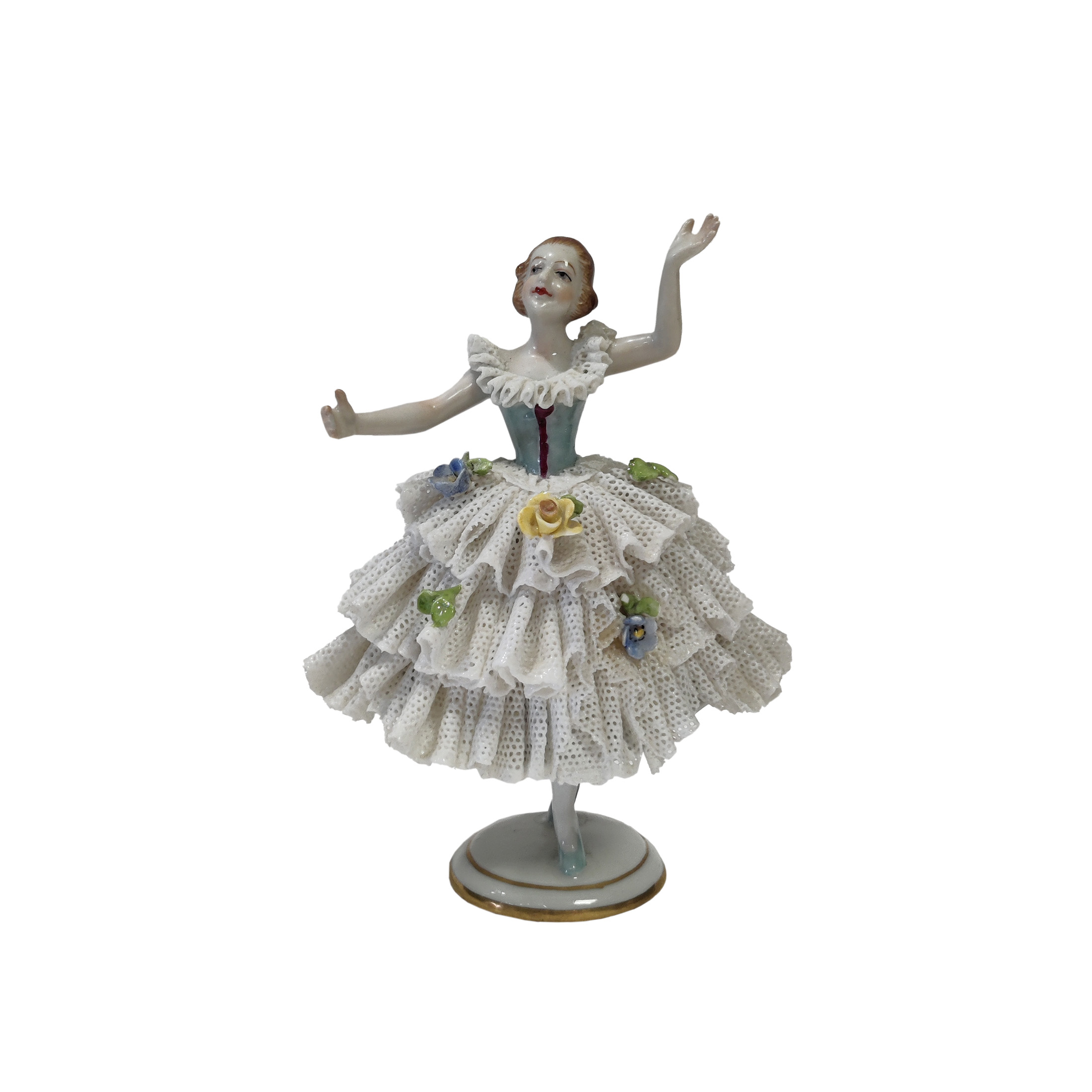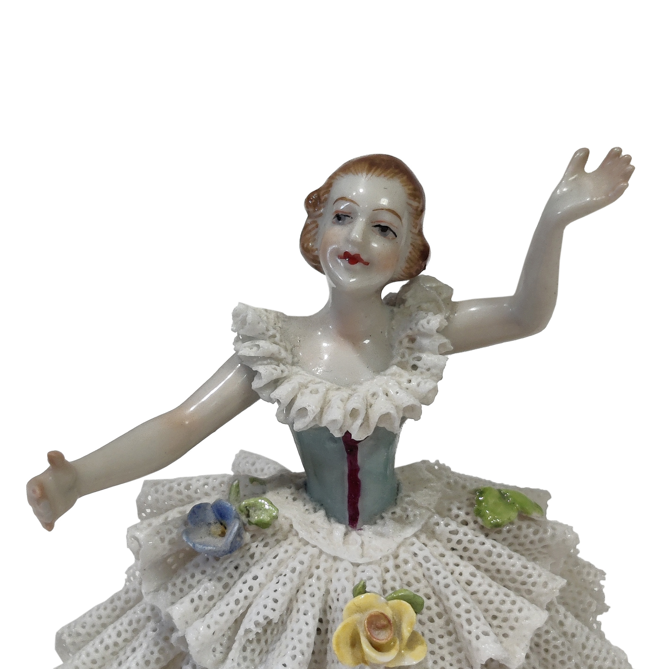 Vintage balleriina posliinifiguuri, peräisin Volkstedt-tehtaalta Saksasta,joka on yksi Saksan vanhimmista posliinitehtaista.Hyvä kunto.Mitat: korkeus n.10,5 cm leveys n. 8,5 cm.