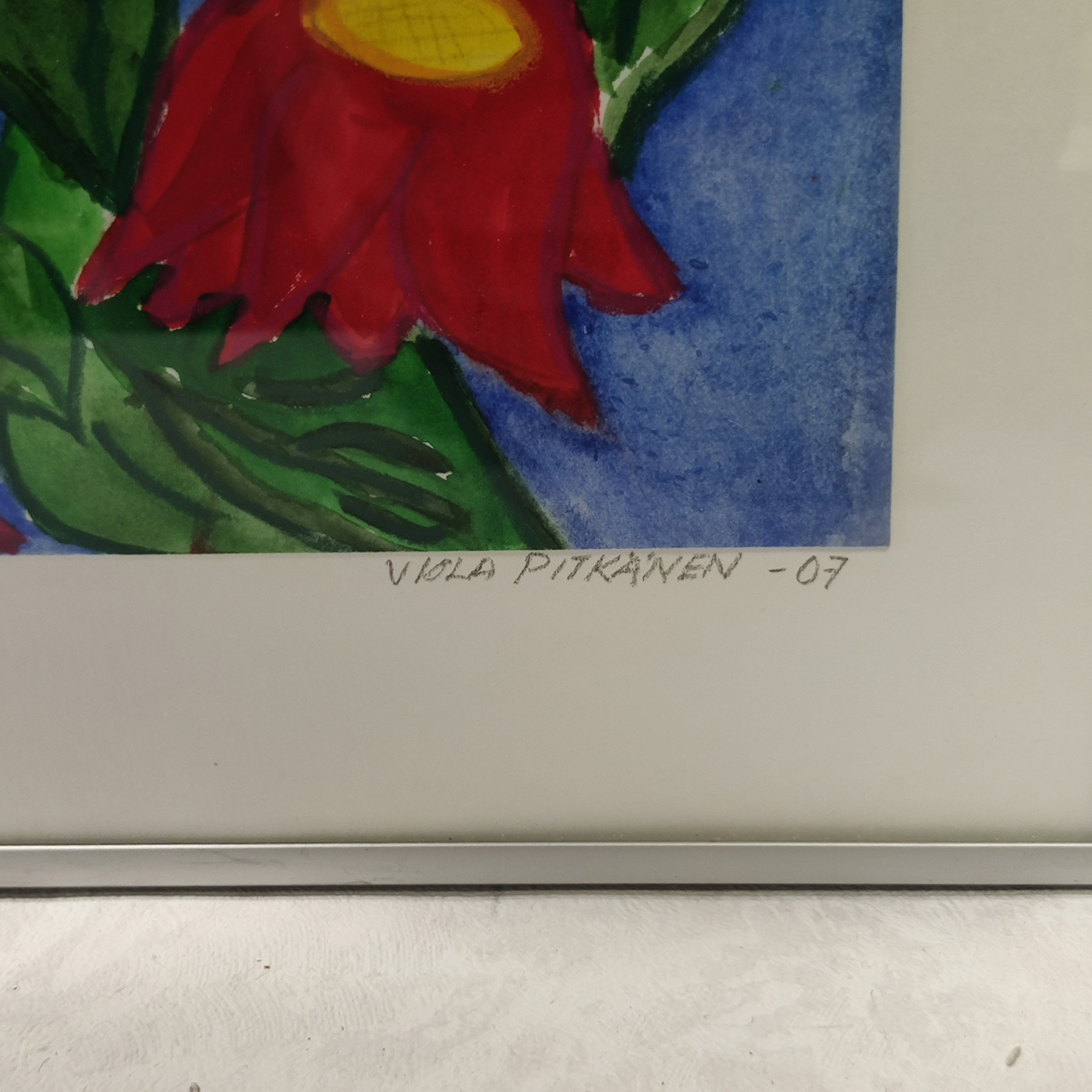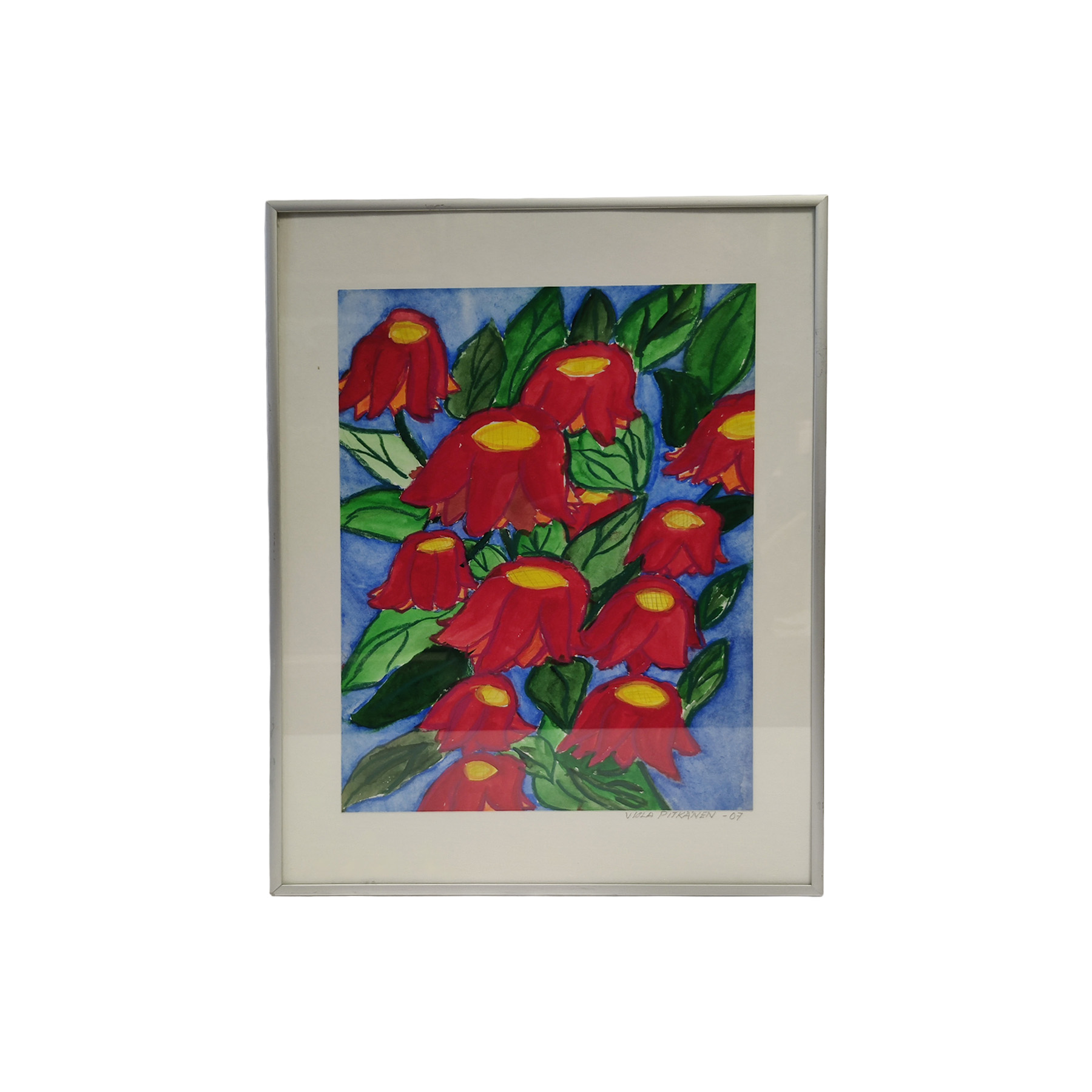 Viola Pitkänen – Kukat -taulu.Hyvä kunto, kehyksessä vähäisiä käytönjälkiä.Mitat: n. 30,5 × 42,5 cm.